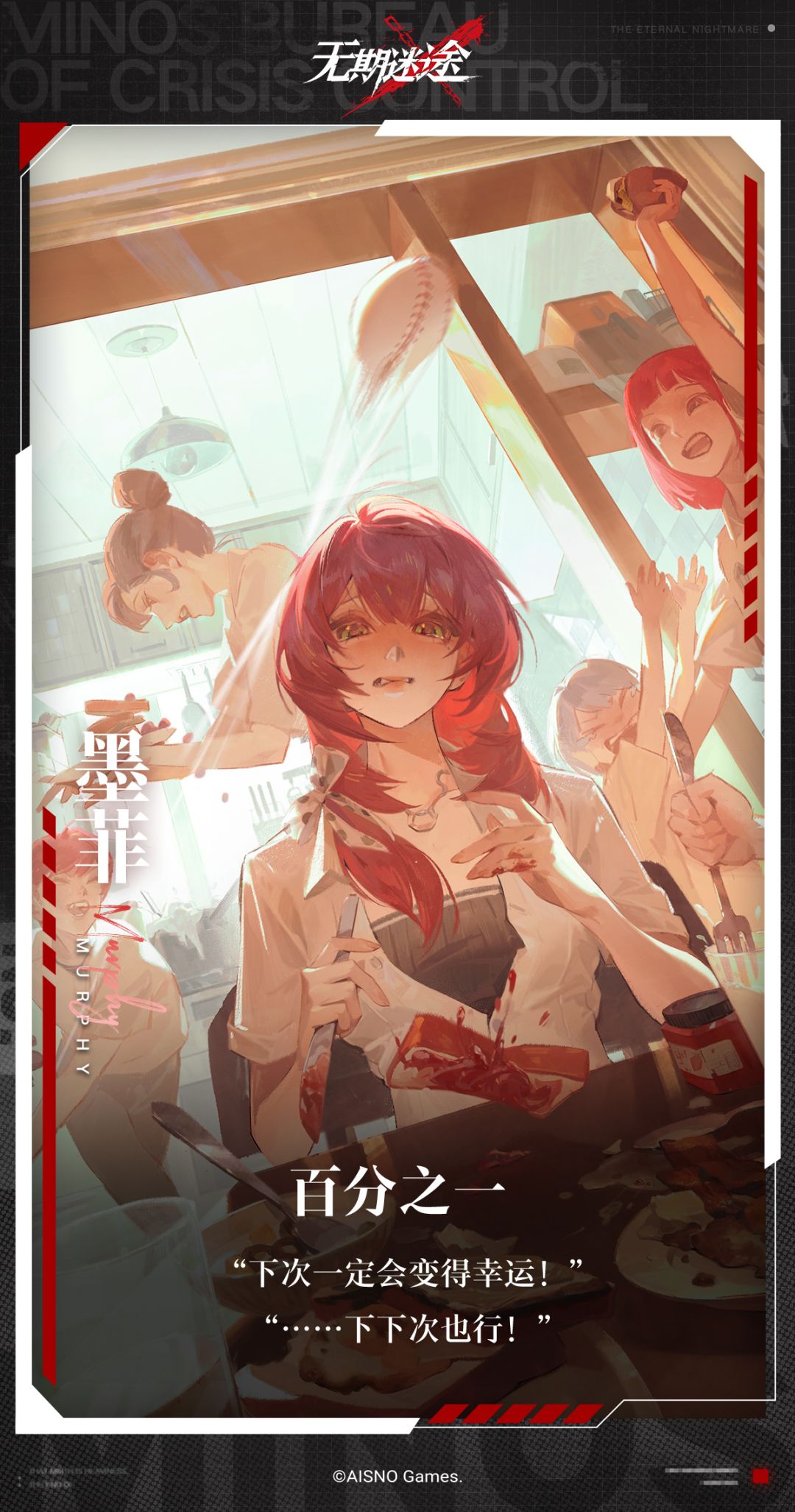 本次推出的「百分之一」作为墨菲的专属烙印,完美贴合角色核心设定。官方公开的两句角色台词——“下次一定会变得幸运!”“……下下次也行!”,精准还原了墨菲始终被霉运环绕,却始终保持乐观、永不放弃的性格特质,简单的话语满是治愈感,也让角色形象更加鲜活立体。