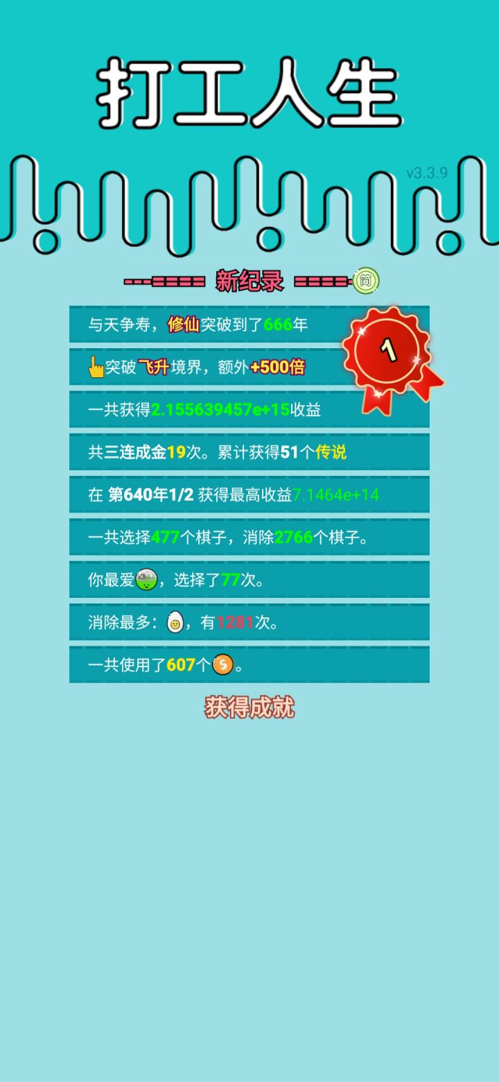 我打工坚持了666年。获得了第1名。共获得2.155639457e+15收益。累计获得51个传说棋子。共选择477个棋子,消除2766个棋子。我最爱道具盲盒,选择了77次。