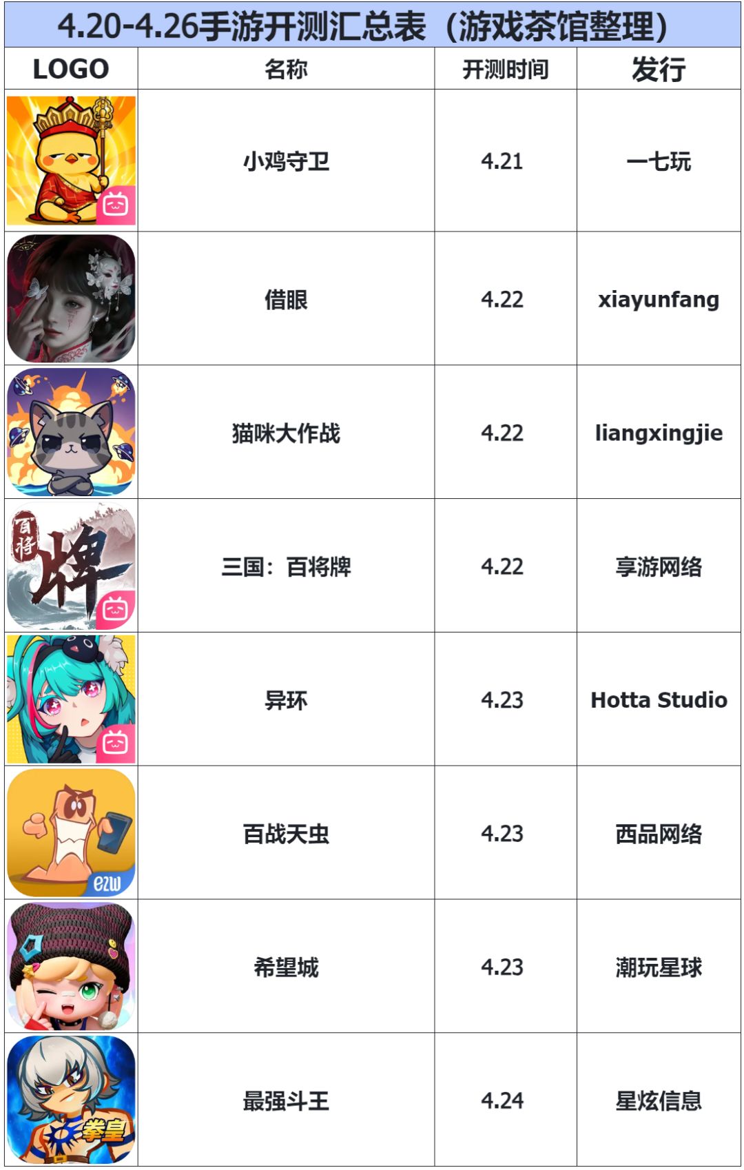 游戏茶馆整理了本周(4.20-4.26)即将上线的新游戏