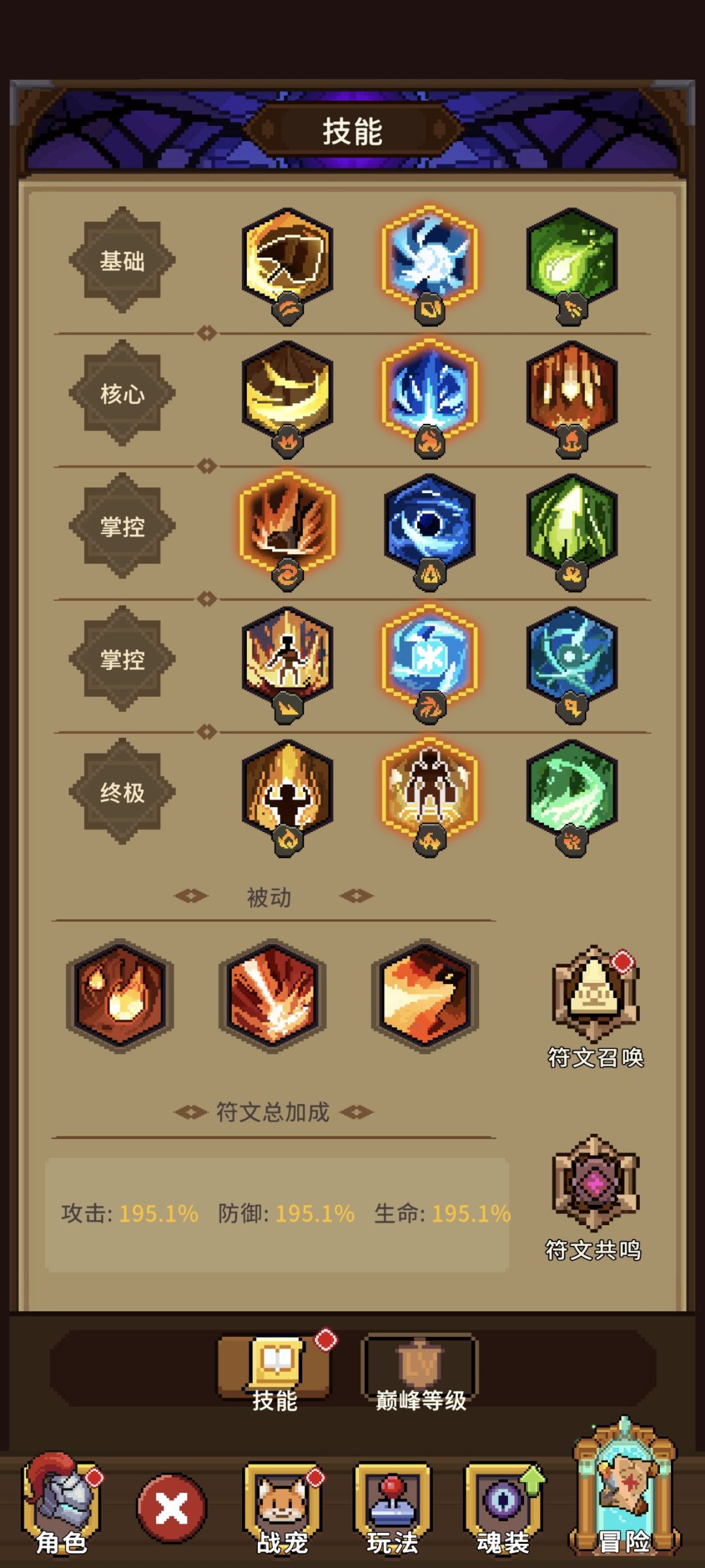 上面说的只是技能里面的核心技能架构,但是我们的技能是由:1基础、1核心、2掌控、1终极组成,其中基础、掌控、都是有细分2个分支的符文技能也就是小技能,我们需要点击装备才能生效小技能的效果,符文抽取可以提升技能等级。