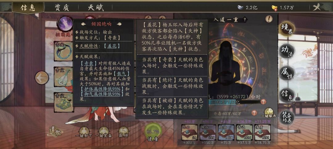 装备养成:目前该弟子没必要穿红装,武器主属性选择双破招,衣服选择双生命,戒指、裤子、鞋子看队伍构成,外伤多就主护体副御气,内伤多就反过来,也可以看天赋减防平衡配比。如果要养成的话可以穿戴红武跟红戒指,洗练内伤加成。