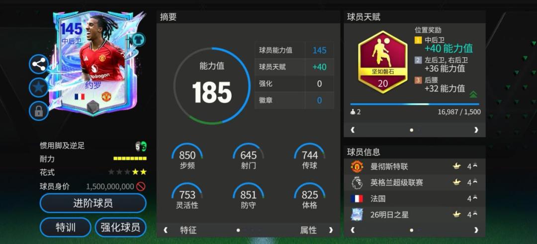 天赋方面,约罗配备了中后卫球员比较常见的坚如磐石天赋,提升了他的冲刺速度等数据。花式方面,作为中后卫的他配备了高级油炸丸子,具备一定的后场摆脱能力。中等+高的攻守效率也让约罗在场上的防守存在感显著提升。