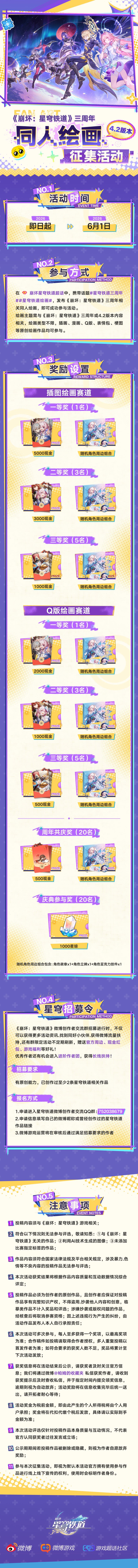 活动投稿期为即日起至2026年6月1日,参与方式简单明确:前往崩坏星穹铁道超话,携带话题#星穹铁道三周年##星穹铁道绘画#发布原创同人绘画作品,即可成功参与。官方将严格筛选投稿内容,确保每一份创作都能获得公平展示机会。