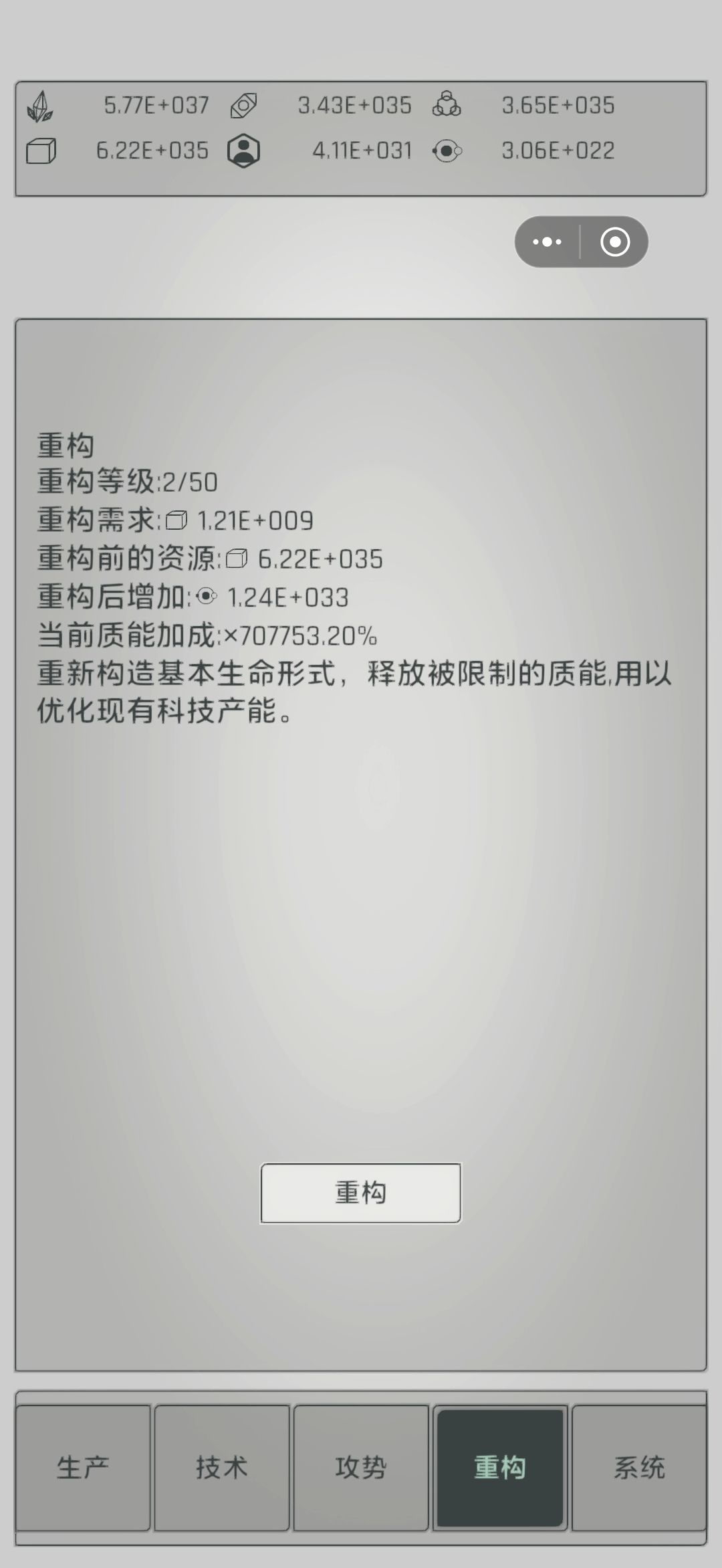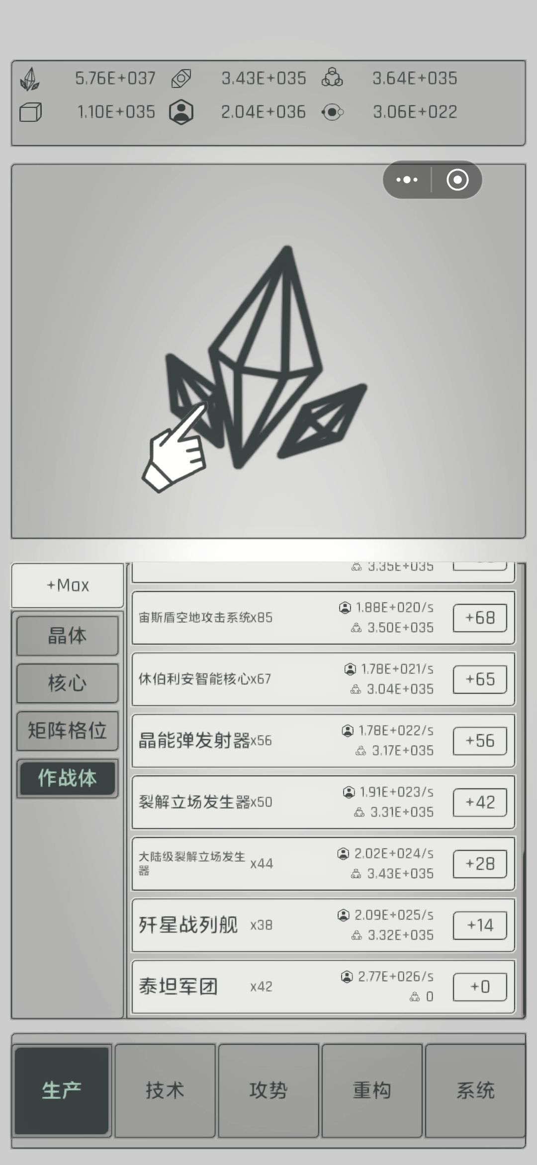 该游戏类似物种起源,采矿提升,几个体系互相承接,最后产出终极产品用于提升科技和转生。提升科技可以增加各体系产出效率。