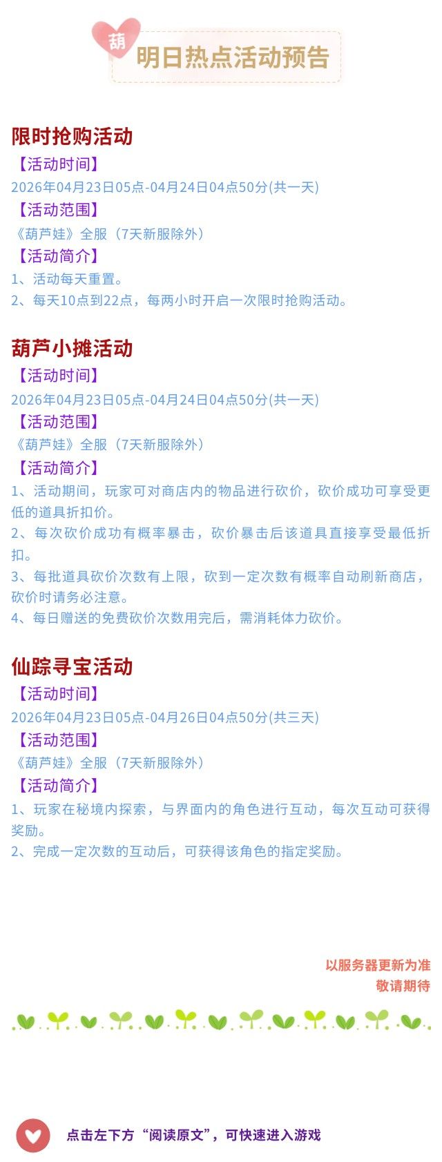 【葫芦娃】4月22日活动预告