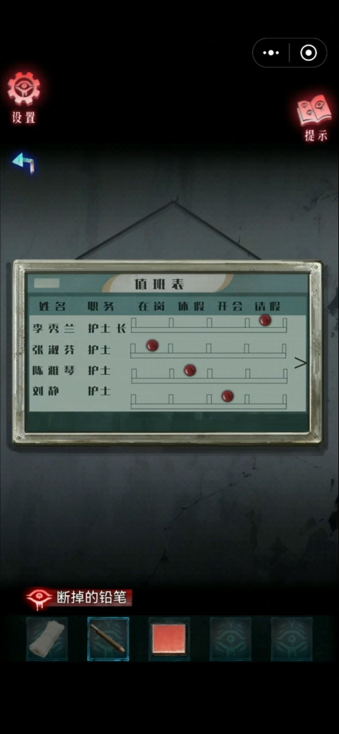 走廊左侧墙上的值班表根据药方线索把护士长和张护士的位置换一下顺序 获得滑块
