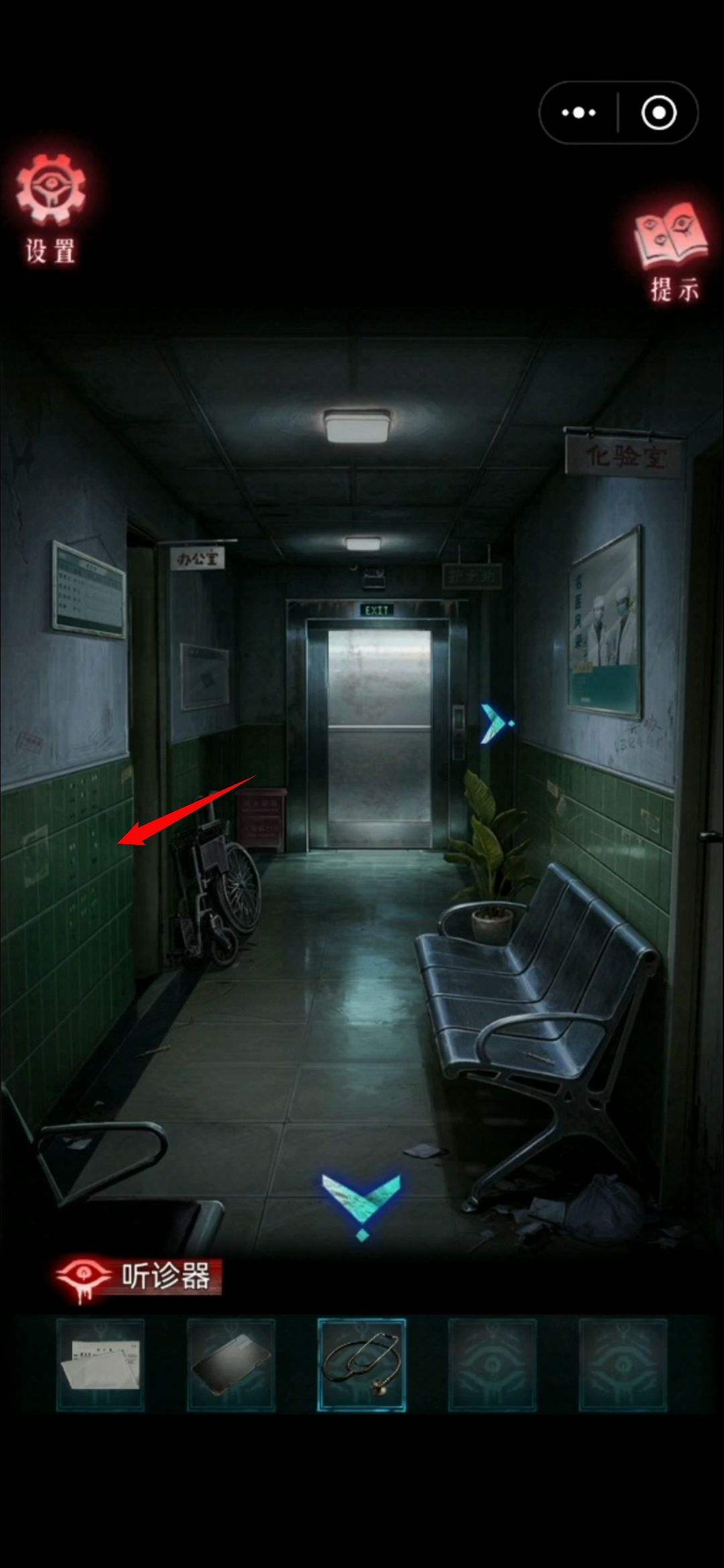 窗户上获得抹布 视力表喷酒精喷雾 用抹布擦干净 获得病房内包包的密码 上下左下 调整密码获得断掉的铅笔
