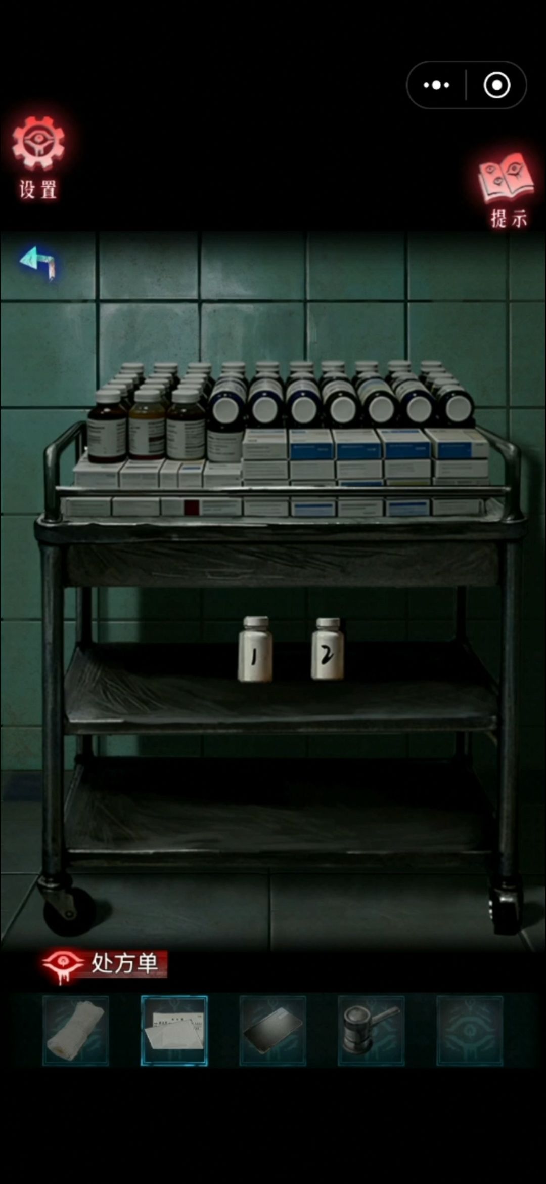 一楼大厅推车完成小游戏获得药瓶1 药瓶2 放到办公室左边柜子里 完成算术题获得镊子 镊子夹出取药口缝隙里的钥匙 钥匙打开休息室 左侧放了杯子和纸的凳子下有两截断掉的晾衣杆 用绷带固定 勾下晾衣架上的护士服 获得听诊器 用来听走廊墙上的盲文声音 获得顺序 回到休息室按顺序打开柜子 获得紫外线灯