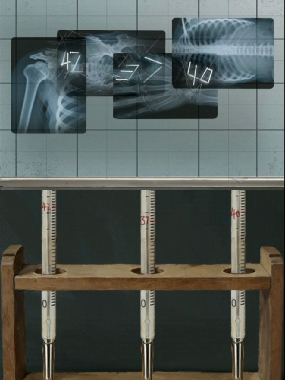 回到休息室 左边柜子放上温度计 根据x光片的线索调整为42 37 40 获得更衣柜钥匙