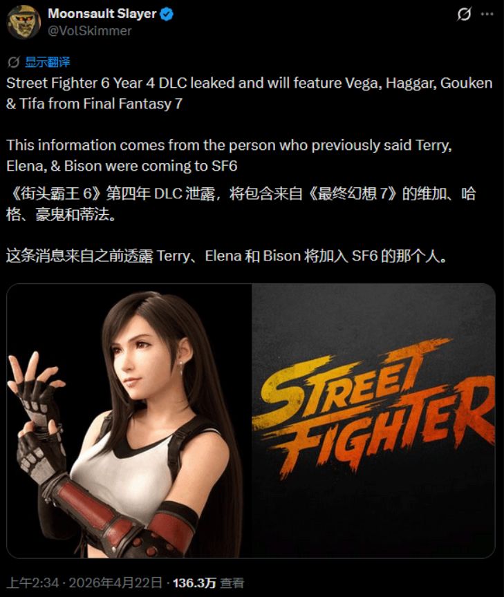 据外媒The Gamer报道,Reddit用户RnK_Clan近日爆料,《最终幻想7》人气角色蒂法、巴洛克(维加)、哈格以及隆的师父刚拳,有望作为新角色加入《街头霸王6》。但该帖子发布后不久便被作者主动删除,由于此人此前曾准确剧透第二季角色阵容,信息具备较高可信度。