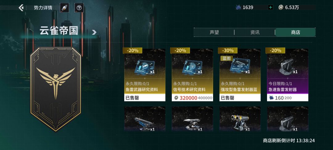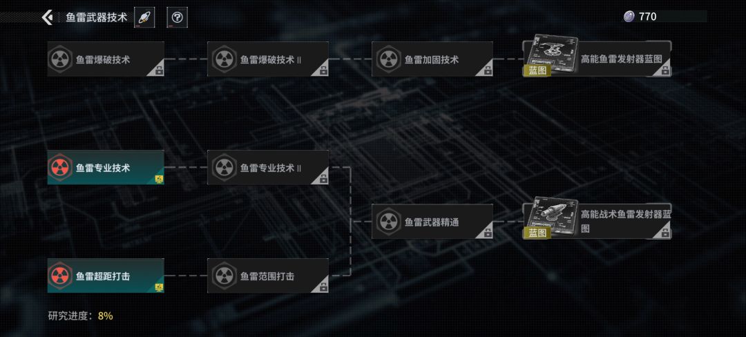 2云雀帝国势力商店中出售的鱼雷武器研究资料,点仓库使用后可以在科技里找到,最后一项有核弹的蓝图。大多数强力武器都可以在势力商店里找到。