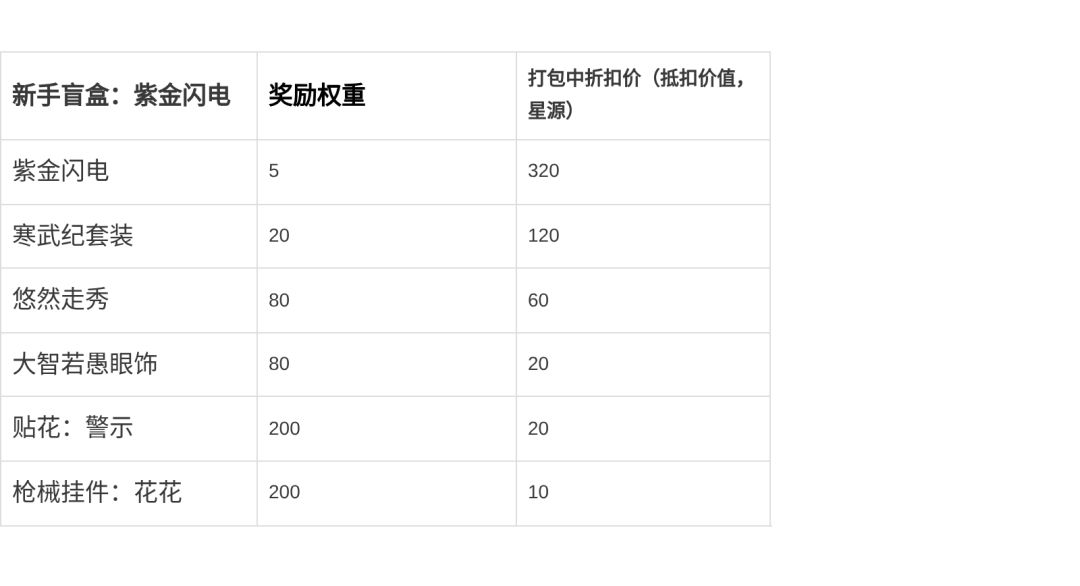1)当第1次进行「新手盲盒:紫金闪电」抽奖时,获取「紫金闪电」的概率 = 「紫金闪电」的奖励权重/奖池中全部6个奖励的奖励权重 = 0.85%(5/(5+20+80+80+200+200) = 0.85%)
