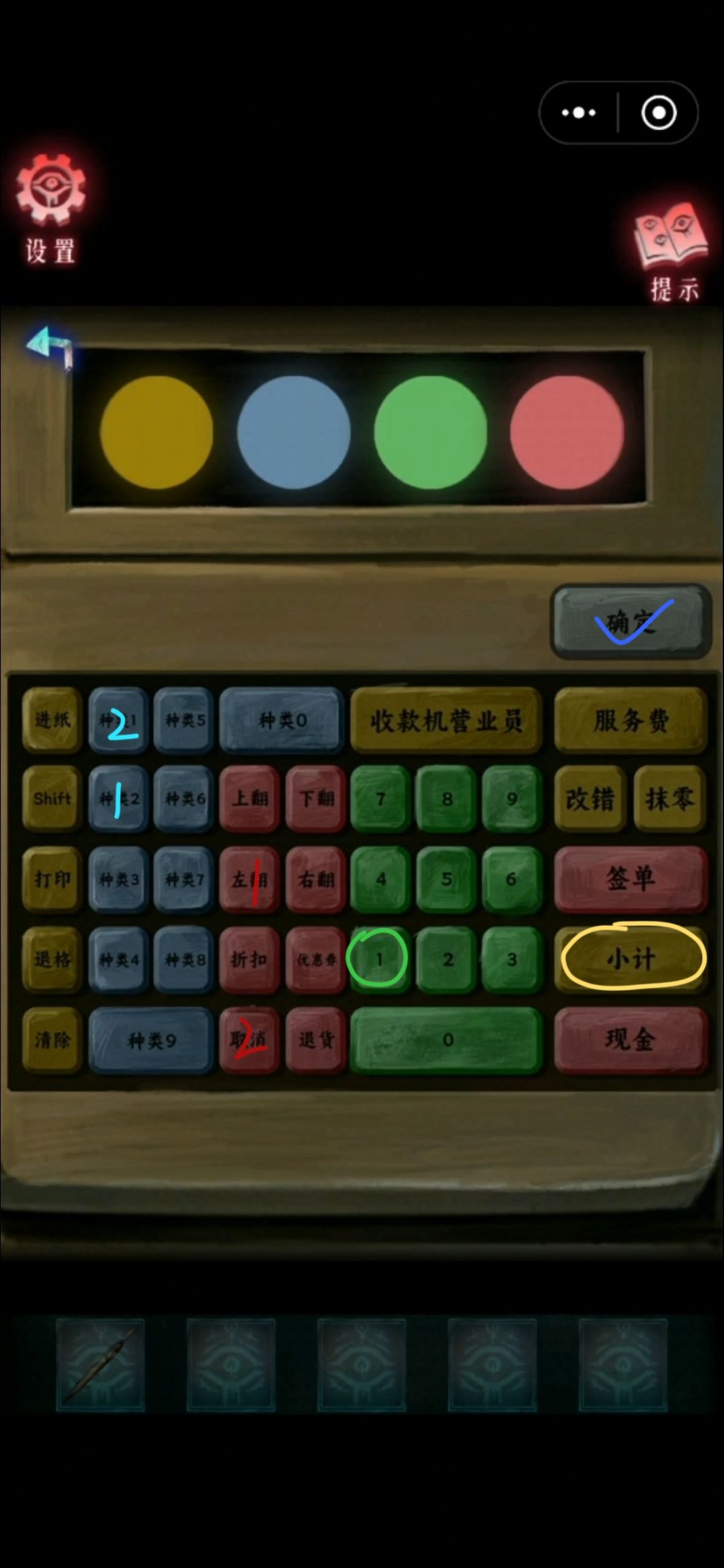 根据日历和小卖部玻璃柜台里冥币的线索 依次点击收银机上的按钮 如图 获得转盘按钮