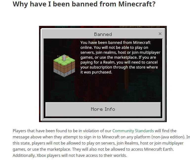 基岩版加入了封禁系统,违反社区准则的玩家将被永久封禁(且不支持解除封禁,包括Mojang员工也不行)。