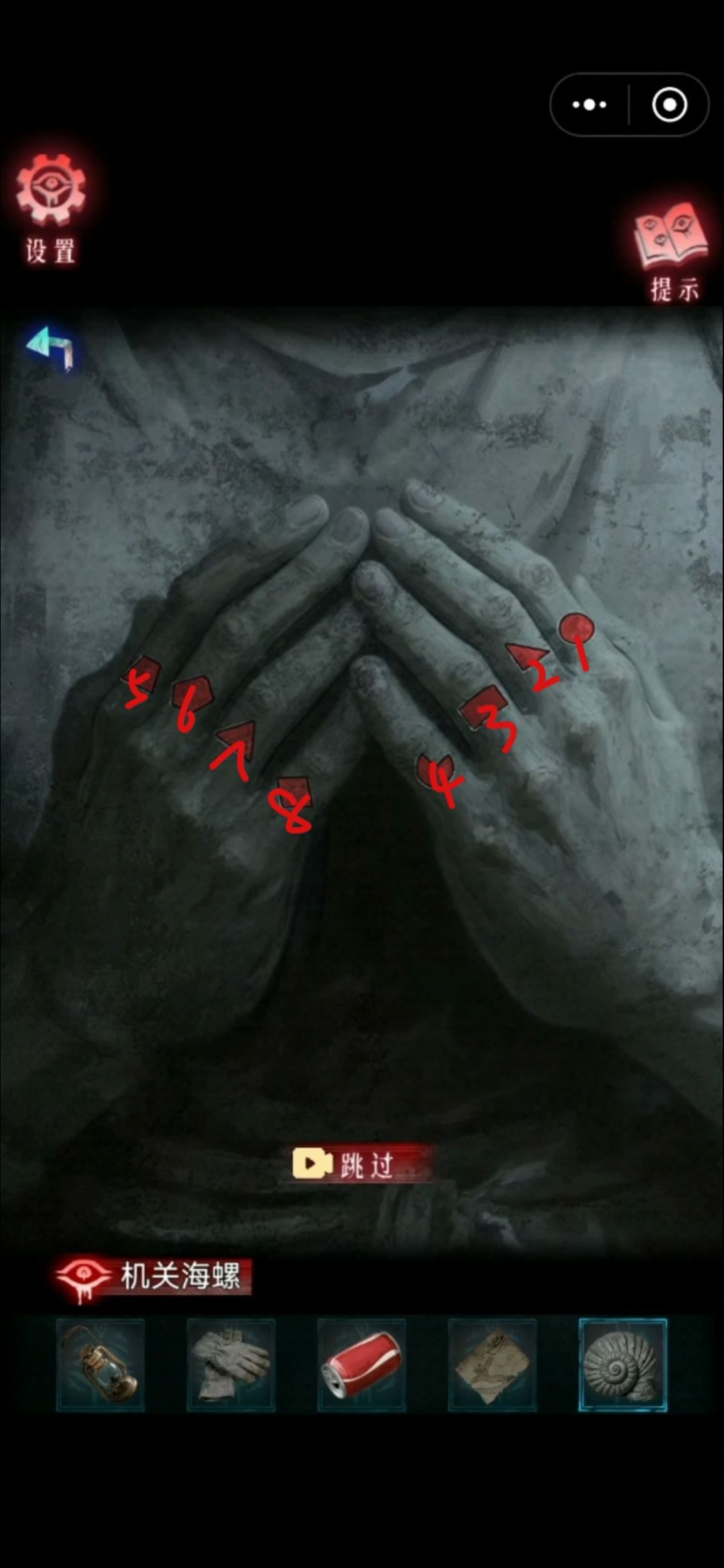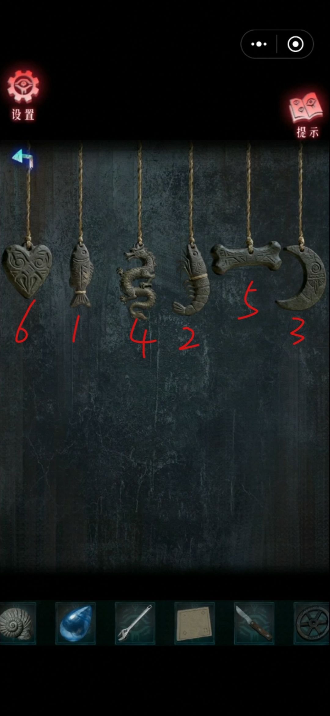 根据窗户上手掌数字和保险柜图案提示 顺时针转动数字到21 逆时针转到37 获得咸水歌 回到外面 根据咸水歌意象 依次点击大门边挂着的物品 如图 获得符号图2