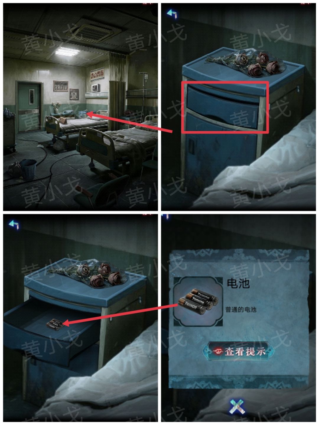 1.打开另一个病床柜子的抽屉,获得【电池】