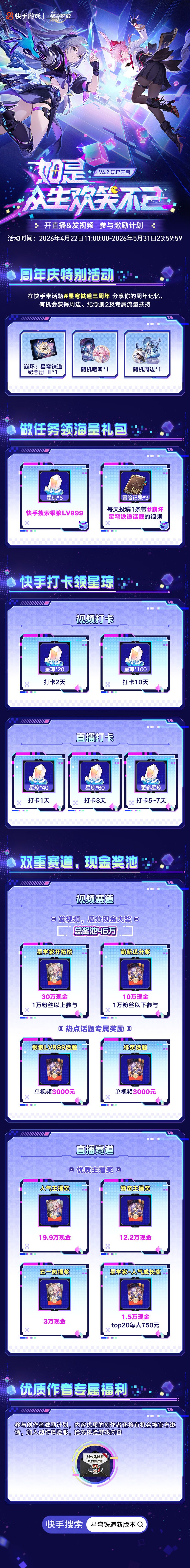 本次活动时间为2026年4月22日至5月31日,持续超一个月。参与方式十分简单,玩家只需在快手平台,发布与《崩坏:星穹铁道》相关的原创视频、图文等作品,或开启游戏直播,同时带上指定话题标签#崩坏星穹铁道#、#如是众生欢笑不已#以及#星穹铁道三周年#,即可成功参与活动。