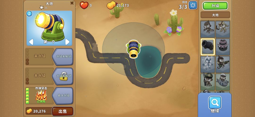 虽然今天是普普通通的第三波,气球的buff也只是简简单单的全员迷彩,但是他们几乎把所有猴子的迷彩分支给禁用了,好在钱给的多可以用500回旋镖(大刀王)的环绕回旋镖可以打迷彩或者用050冰猴的技能也可以打迷彩气球甚至可以用005大炮,它的被动效果也能通过
