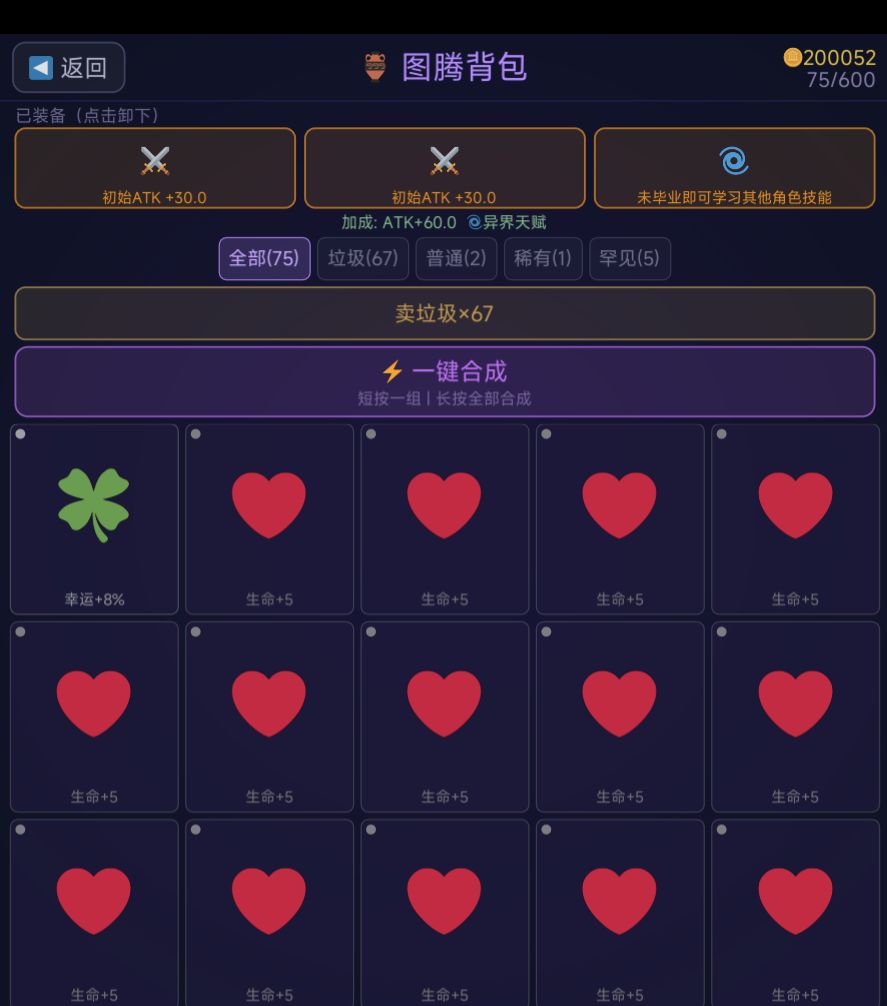 - 合成系统: 3个同品质图腾合成1个新图腾,30%升品质 / 50%保持 / 20%降品质。罕见级无法合成。长按合成按钮可一键批量合成!