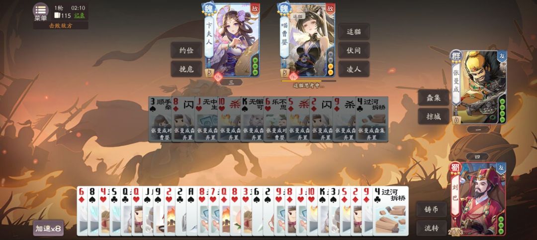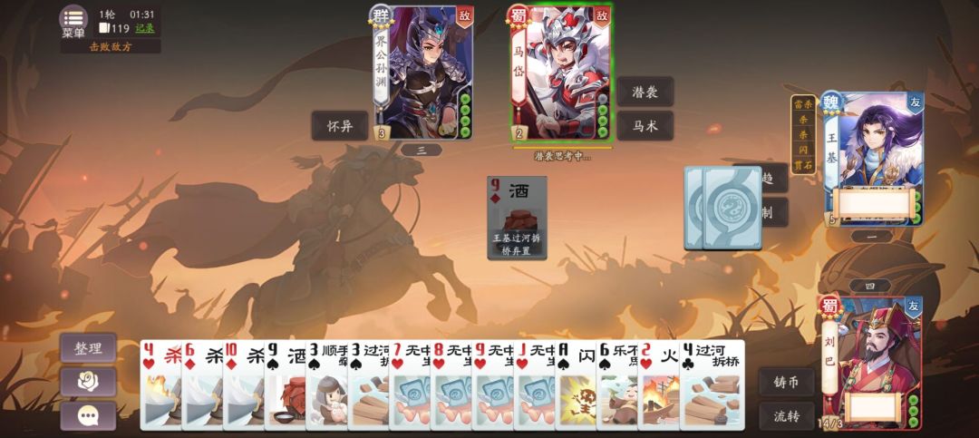 欢杀的王基或者界王基,通过对敌方用牌来奇制自己手里的方片牌,能够配合刘巴铸币进行局部过牌,虽然牌堆的无中生有只有4张,但是欢杀的界王基可以通过对自己用牌丢对面牌,丢到同类型牌可以继续过牌,总体过牌量还是有的,运气好的话一轮能过十几张牌。