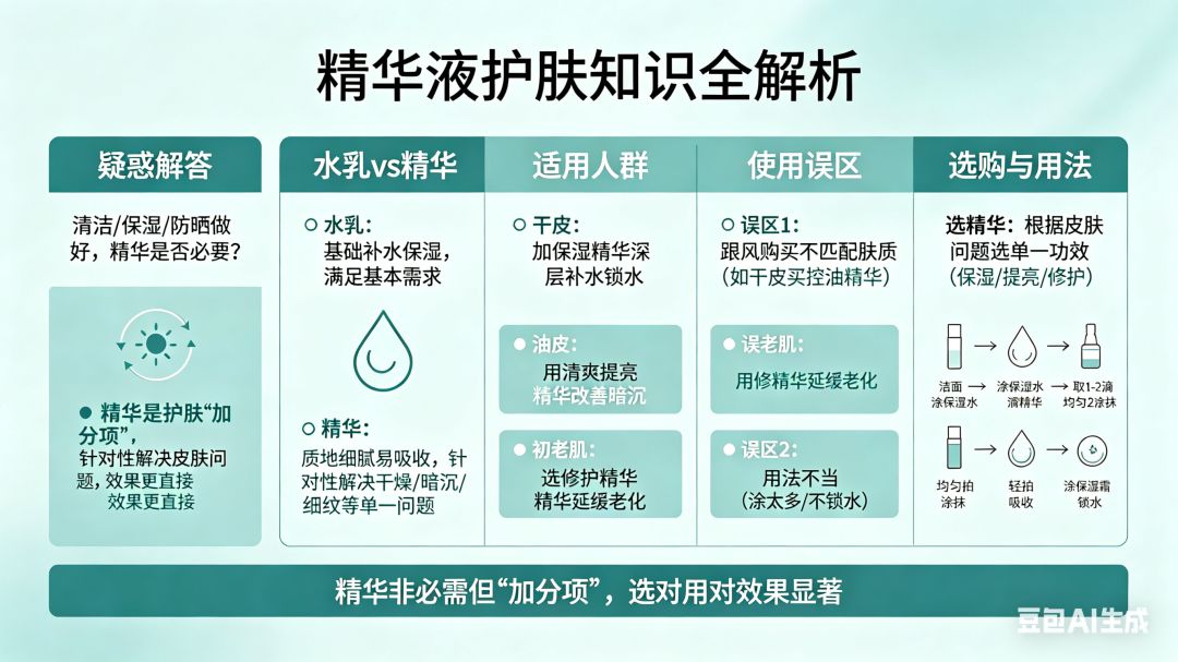 很多人护肤时都会疑惑:清洁、保湿、防晒做好就够了,精华到底要不要用?是不是智商税?其实精华不是可有可无的多余步骤,它就像护肤里的“加分项”,能针对性解决皮肤问题,比单纯涂水乳效果更直接,只要选对、用对,就能让护肤效果翻倍,尤其适合有特定肌肤困扰的人。