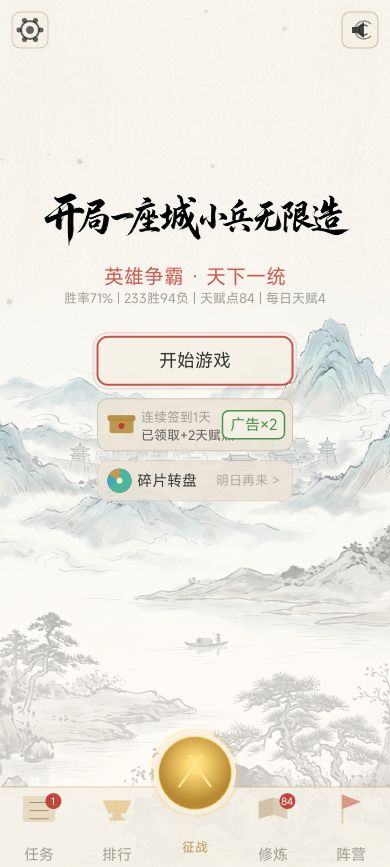 同类游戏最大的问题是"每局都是一次性体验"——赢了没积累,输了没收获,角色换个颜色而已。我想解决的就是这两件事:让每一局都不白打。 胜利获得碎片和天赋点,失败也有少量收获。天赋树跨局永久继承,碎片可以升级英雄技能,玩家能真实感受到自己在变强。每天还有免费碎片转盘和每日宝箱签到,不肝也能稳步成长。转生系统让高投入玩家可以把临时天赋永久化,进一步拉长养成曲线。这套局外养成系统是游戏的第一个核心。让选谁真的不一样。 六个阵营不是换皮——朱元璋的"征兵令"是全据点加兵的稳健打法,成吉思汗的"铁骑连射"是多线同时施压的激进路线,赵匡胤的"杯酒释兵"能直接叛变敌方兵力实现翻盘。每个英雄两个主动技能,冷却时间不同,配合天赋树的选择,同一张地图可以打出完全不同的节奏。阵营差异化是游戏的第二个核心。在这两个核心之上,26 张手工设计的固定地图覆盖 5 个难度梯度,据点数量、位置、中立势力分布都经过精心调配。连胜越高地图越难,战斗词条和敌方天赋镜像系统让后期每一局都充满变数,不存在固定最优解。