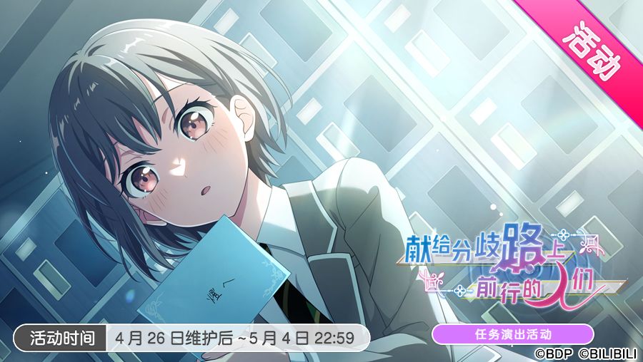 4月26日维护后,游戏内将开启「献给分歧路上前行的人们」任务演出活动、「每日自有新风吹拂招募」和「PURE属性招募」,并追加原创歌曲《Mas?uerade Rhapsody Re?uest》!