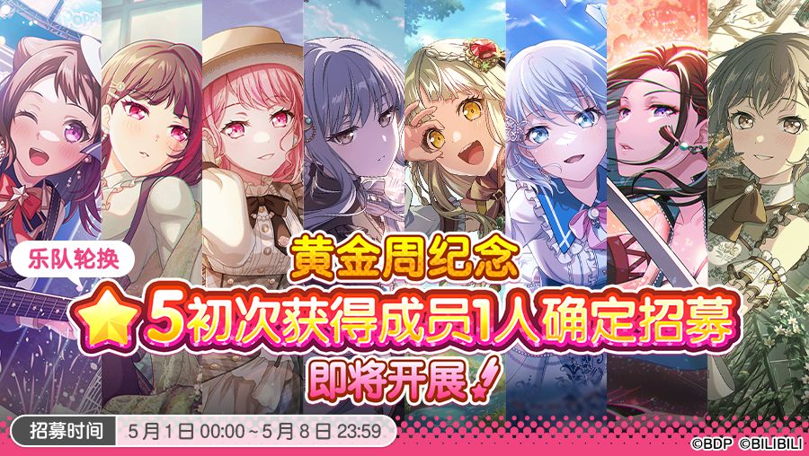 为纪念五一黄金周的到来,5月1日至5月8日,游戏内将每天开启一支乐队的「黄金周纪念★5初次获得成员1人确定招募」!活动期间使用付费星石进行十连招募时,必可获得一位初次获得的对应乐队★5成员!
