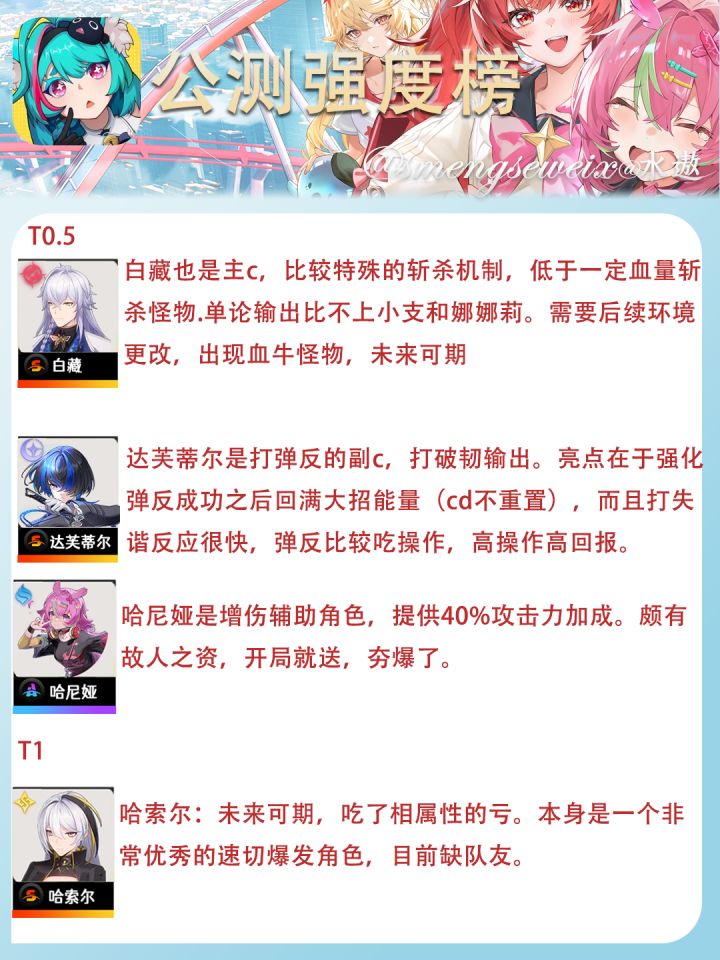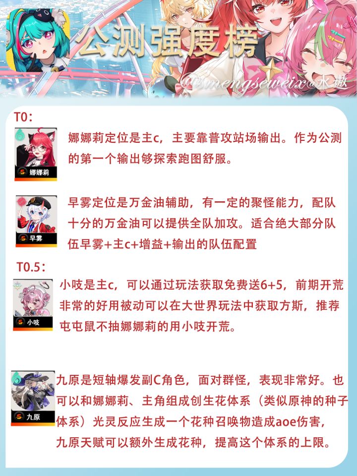 本榜单仅反映公测版本当前环境的综合情况,角色强度会随版本更新及新角色实装而动态变化。没有绝对意义上的“弱角色”,只有尚未找到的合适场景与配队。优先培养自己队伍中的体系核心,远比盲目跟风抽卡更划算。