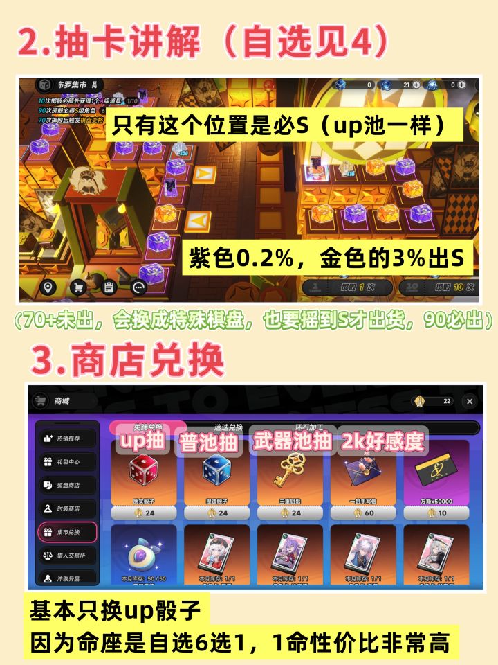 ✨抽卡的话,只有右侧特殊区间,会真的按照骰子出up/S,其他的都是金箱子3%,紫箱子0.2%,然后70刷新盘,90必出。骰子并不是完全的无意义,会小概率遇到送1抽/一些皮肤