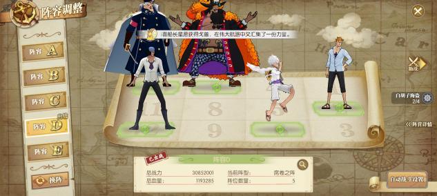 阵容一:蜂巢岛库赞,5档路飞,蜂巢岛希流,未来岛黑胡子,觉醒新世界马尔高(觉醒年轻白胡子)