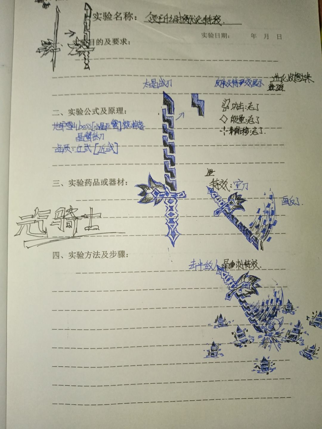 画了一些武器的皮肤以及给闪电五连鞭的进化效果加了点自己的想法,颜色我只有这两种颜色的笔可以更改颜色