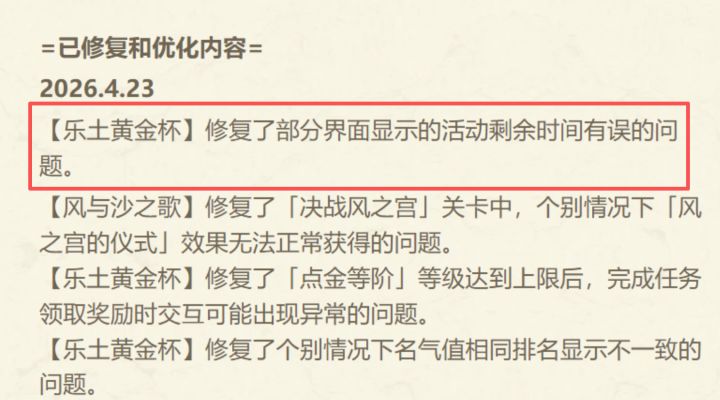 公告里写:【乐土黄金杯】修复了部分界面显示的活动剩余时间有误的问题。