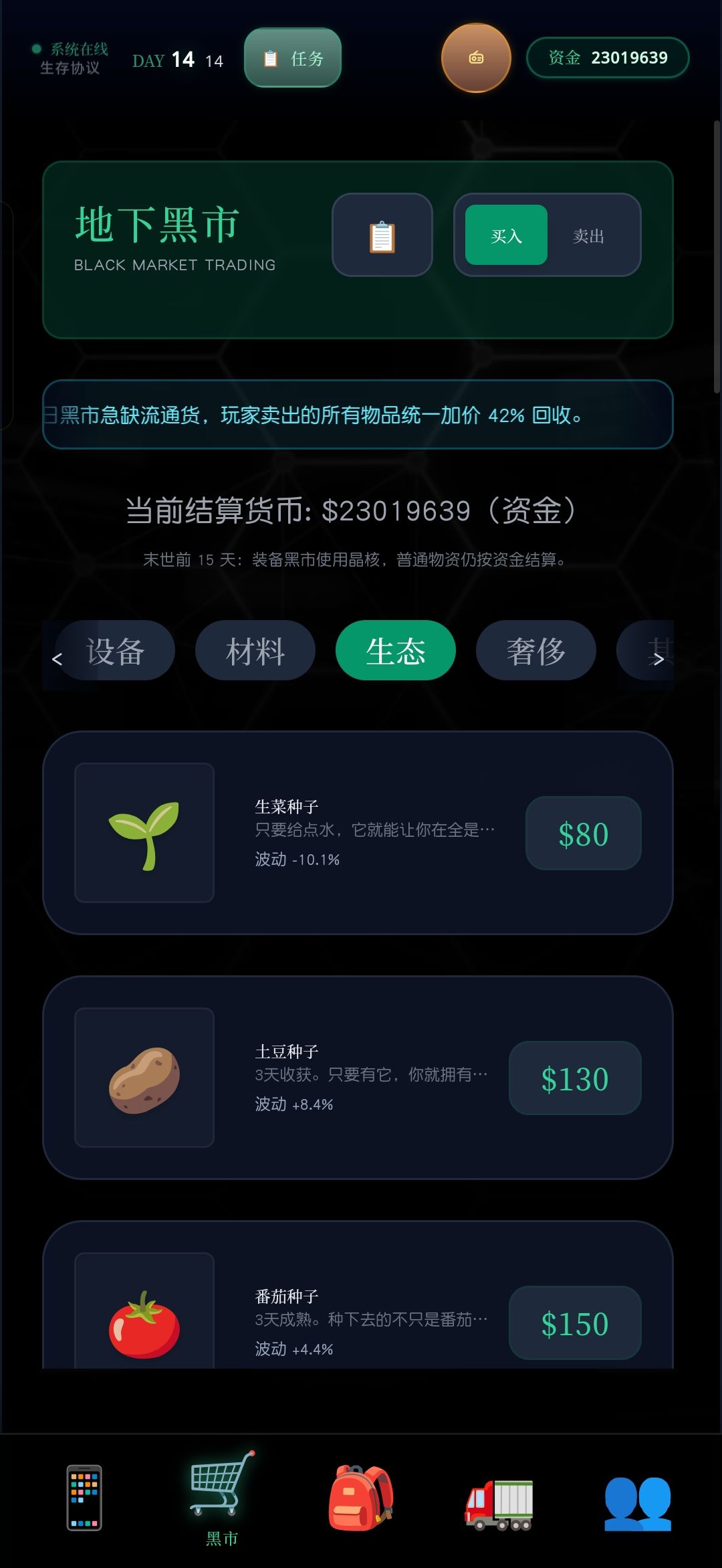 先卖出,价格跌36%,再买入,黑市交易天赋价格-25%,找到黑市回收价格上涨的天数,20-50%波动,一波肥。