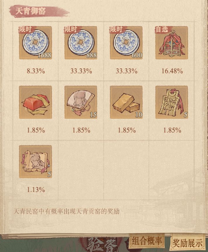 三个区域选择有讲究。民窑是最低级,奖励最差,右上角有600宝钱,拿到这个就可以考虑跳过,如果奖励很差连三次线直接走别浪费铲子。贡窑是中级,奖励比民窑好,进了贡窑建议拿满再走,拿满之后有小概率进御窑大概率回民窑。御窑是最高级,奖励最好,进了就无脑拿满,拿完回民窑重新开始循环。