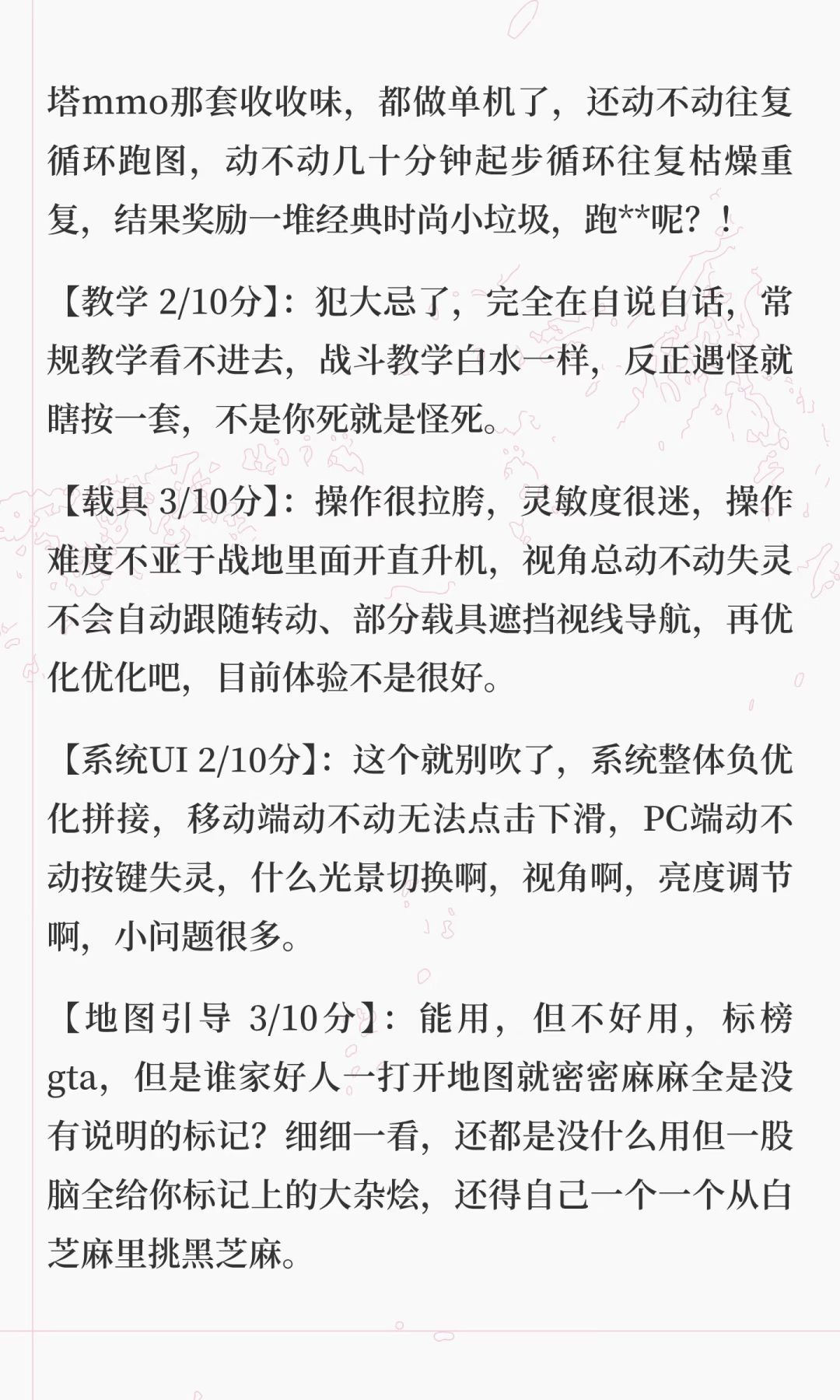 【任务 1/10分】:拖沓繁琐,枯燥乏味,请把你幻塔mmo那套收收味,都做单机了,还动不动往复循环跑图,动不动几十分钟起步循环往复枯燥重复,结果奖励一堆经典时尚小垃圾,跑**呢?!