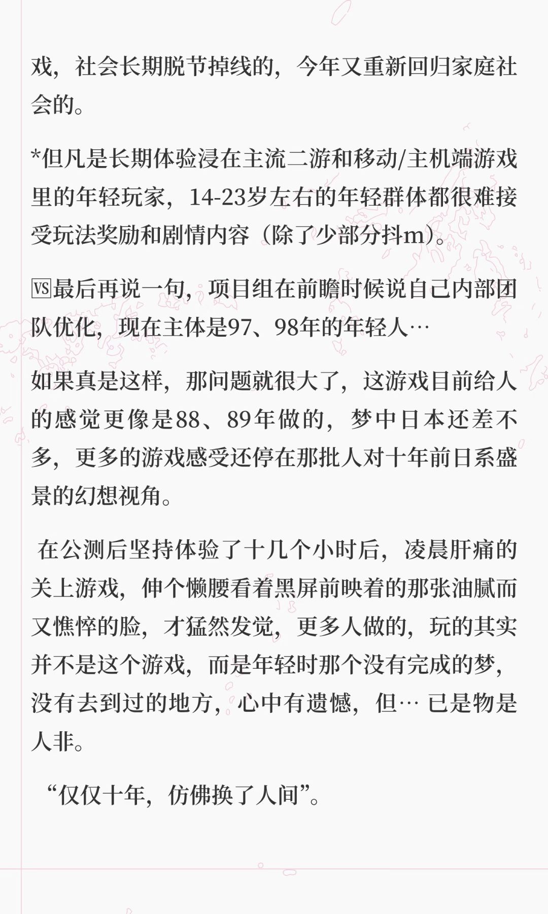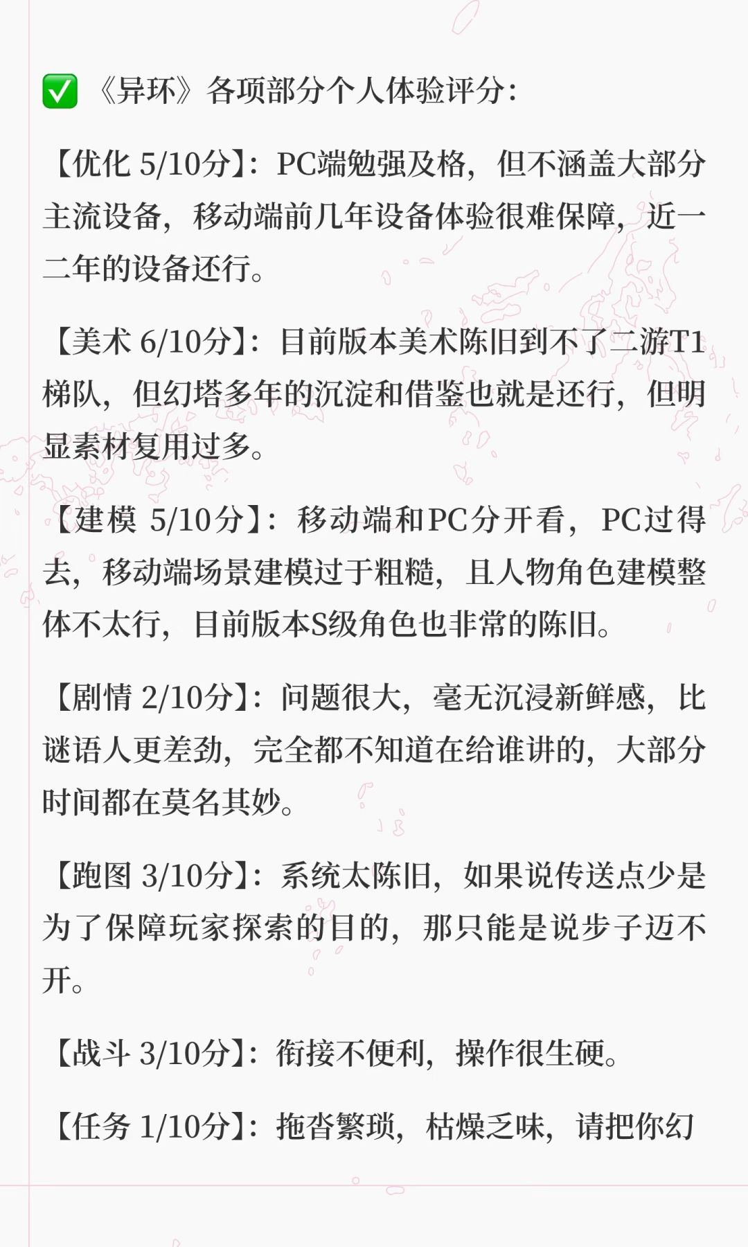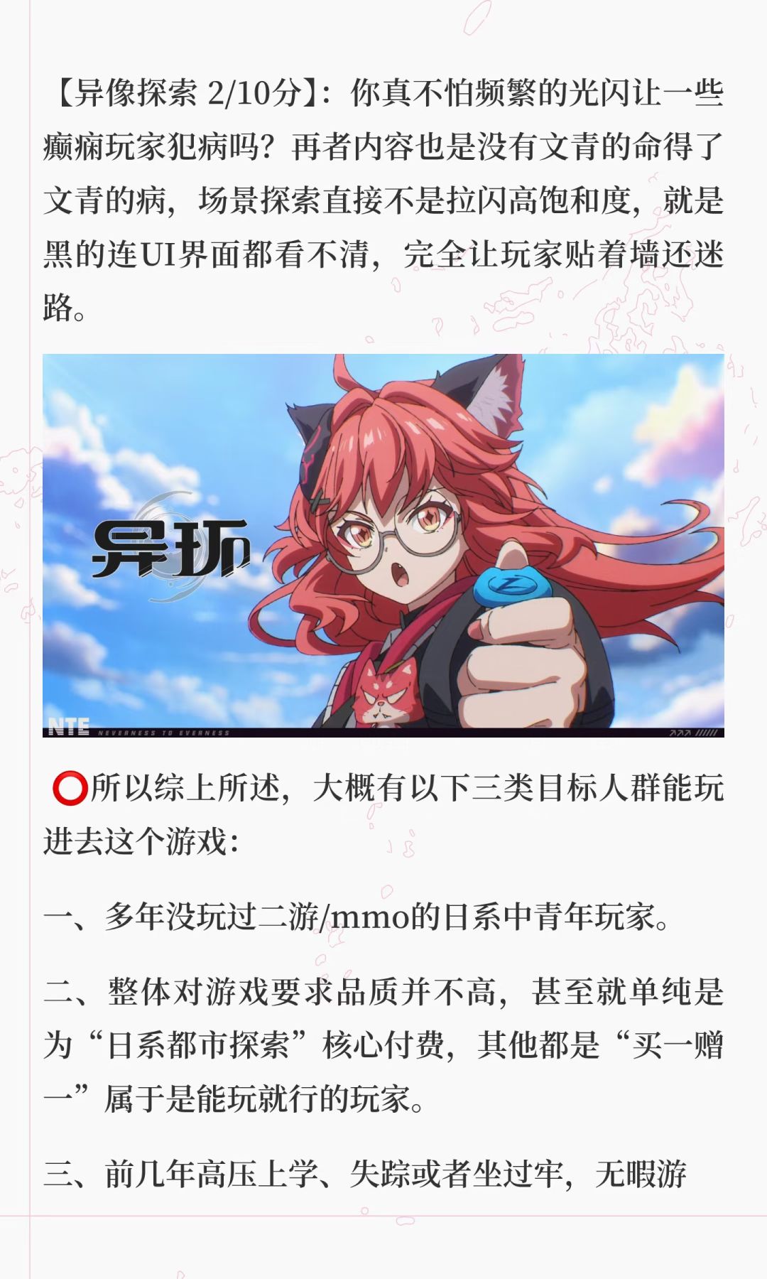 *说这么多,想表达的就但凡是长期浸在主流二游和移动/主机端游戏里的年轻玩家,14-23岁左右的年轻群体都很难接受异环的玩法奖励和剧情内容(除了少部分抖m)。