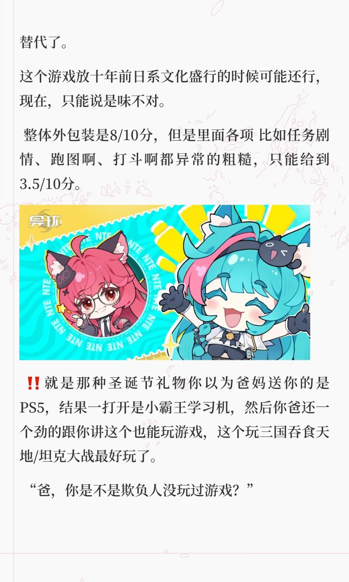 ‼️《异环》就是那种“圣诞节礼物”,你以为爸妈送你的是PS5,结果满心欢喜一打开是小霸王学习机,然后你爸还一个劲的跟你讲:这个也能玩游戏,这个玩三国吞食天地/坦克大战最好玩了。