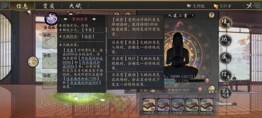 推荐理由:独一档的特性[痊愈]可以保障你的队友获得五秒无敌,可以更好的保护那些脆但需要站场的弟子。奇袭的天赋可以使队友同时获得内外伤加成和攻击身法加成,对一些血厚的怪能打出不俗的爆发。