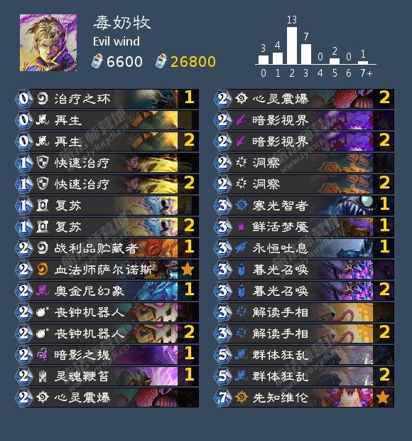 来自 Evil wind 的一套毒奶牧,他用这套以100%胜率从钻3打上了传说。新版本带来的洞察和解读手相是这套的核心,解读手相能够以低廉的费用打出大帝的效果,还能在对抗快攻时提前用出解牌和寻找额外苟活卡,过牌依靠丧钟机器人和战利品贮藏者,能把牌库里的大部分与斩杀无关的随从滤光,之后再使用洞察能够大概率抽key牌。斩杀方式:单维伦情况下快疗打10,震爆打10,复苏和再生打6,维伦加复制后伤害翻倍,解读手相在这一套中并不是能随便使用的卡,至少要手上有3张法术组件再用。(打快攻除外)