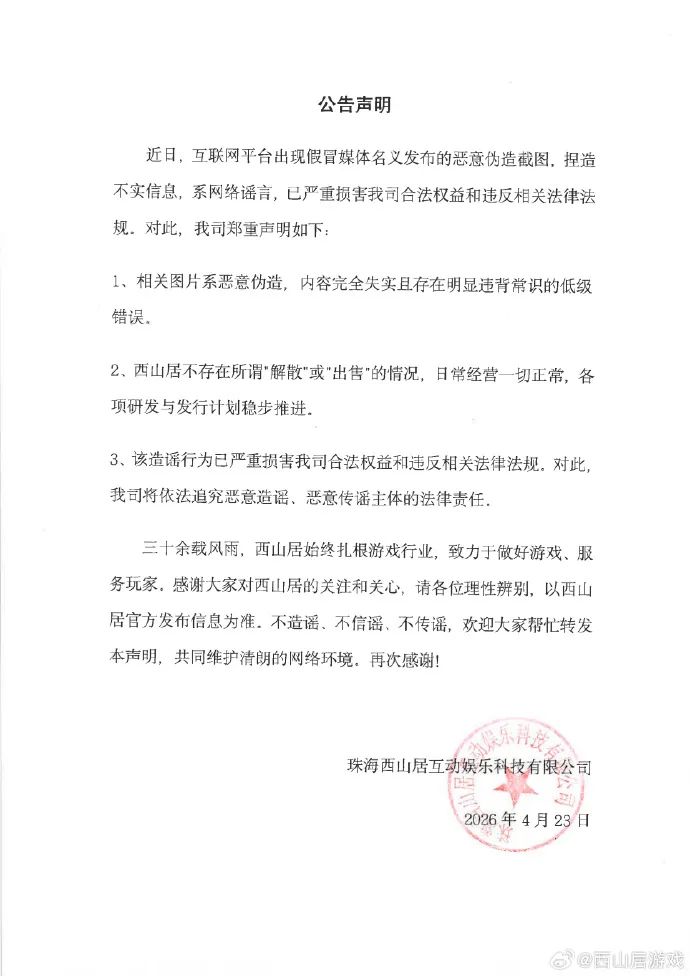 官方在公告中明确三重立场:所有网传相关图片均为恶意伪造,内容完全失实;西山居不存在任何解散、对外出售的情况,公司整体经营状态一切正常,旗下全部游戏项目的研发、版本更新与发行计划均在按原定节奏稳步推进;针对本次恶意造谣、恶意扩散谣言的所有主体,西山居将会依法追究其全部法律责任。