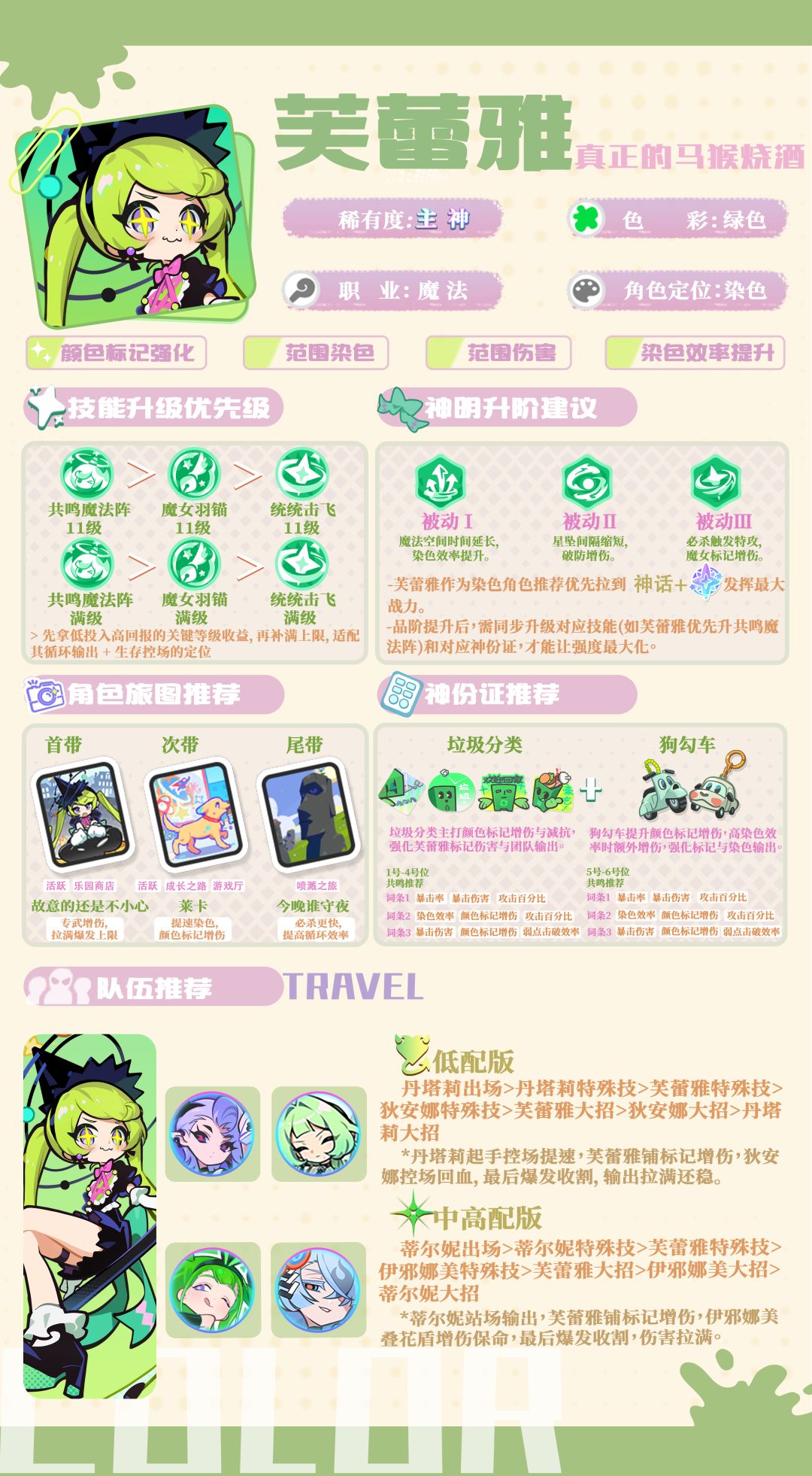 芙蕾雅是绿色染色向魔法师,拥有特殊的“魔女标记”机制,令她脱离了常规意义上的辅助、输出、染色等定位,适用于绝大多数的战斗场景与配队。