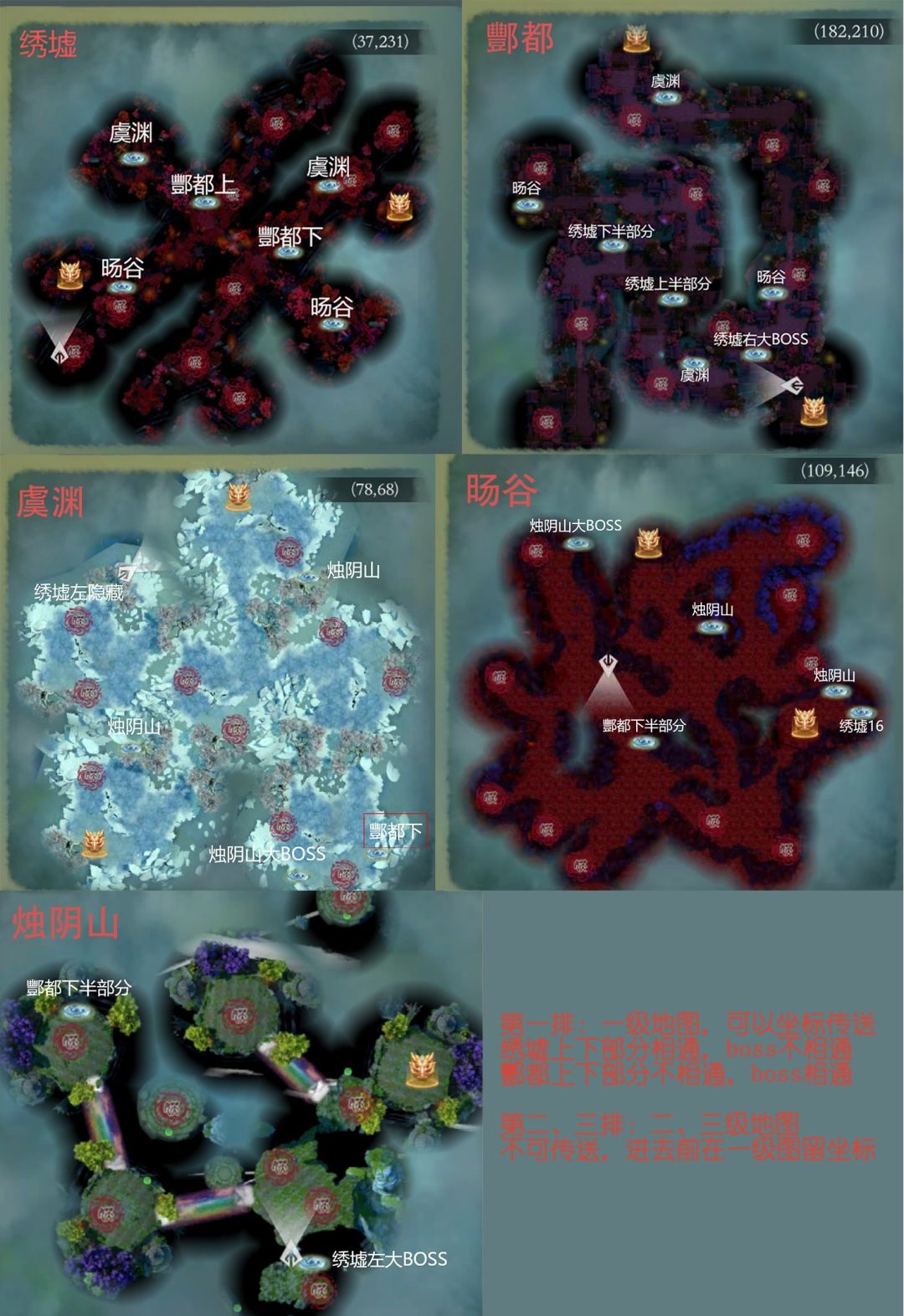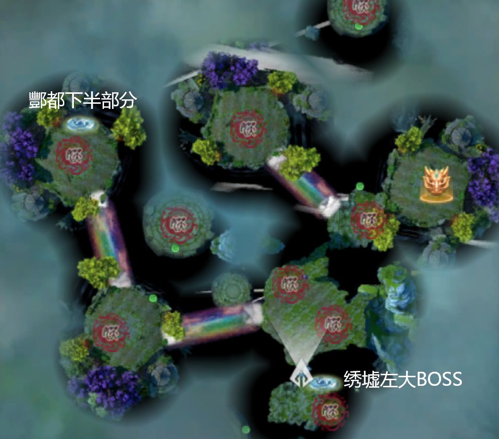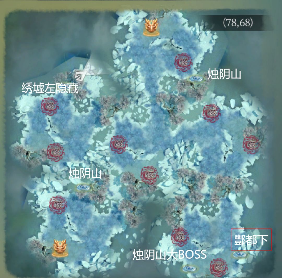 昨天整理了好久,总算把地图大部分区域全部探索完了,上面各个传送点都跑了一遍,可以按照图片来走,绣墟部分有2个隐藏16阶(红怪,旸谷的那个绣墟16就对应一个)。最后那个烛阴山最底下那边是还有一个怪的,地图没完全开全(这张图的绿色点点是传送门,类似仙界下蜗牛)