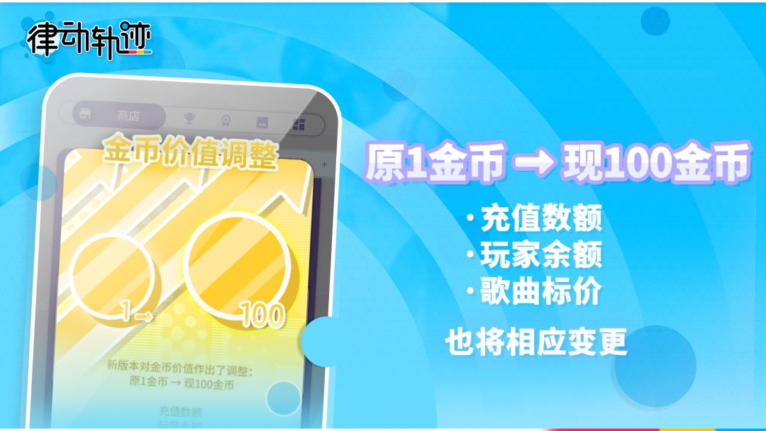 · 新版本的100金币将等价为原1金币,并会同步变更充值数额、玩家余额以及歌曲标价。