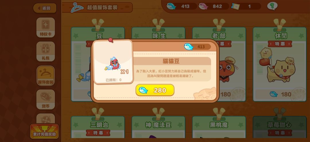 ③超值服饰套装中:新解锁了红小豆系列的服装,显示可购买。点击购买后出现购买失败的情况。
