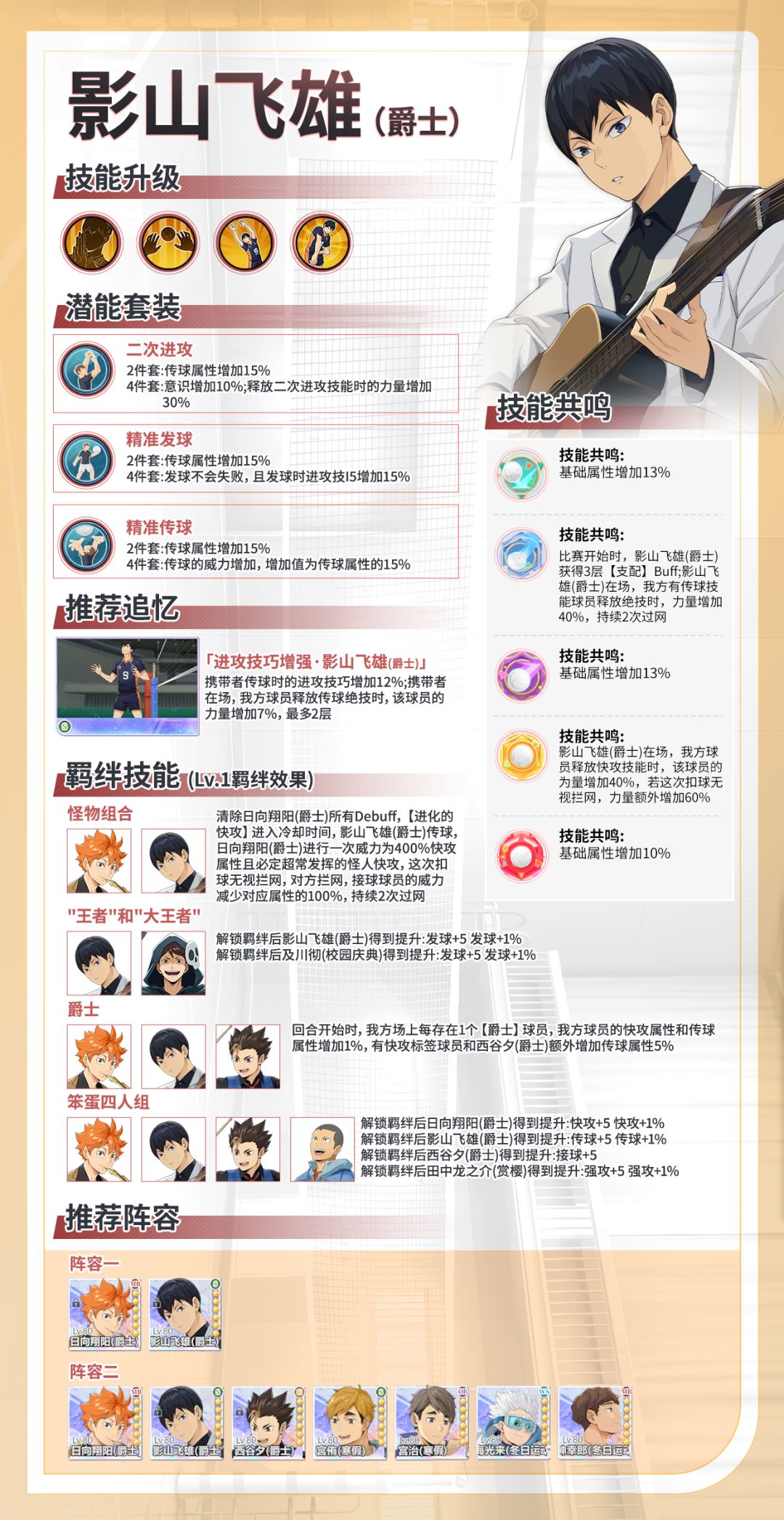🎶 下面带你一张图了解「影山飞雄-爵士(S)」适合的潜能套装、适配的追忆、技能共鸣介绍、角色独特羁绊、优质阵容组合!