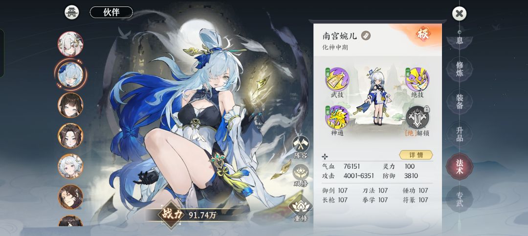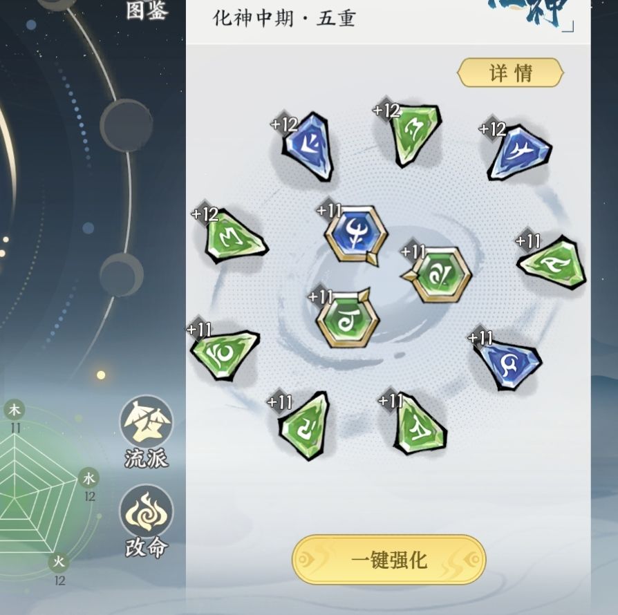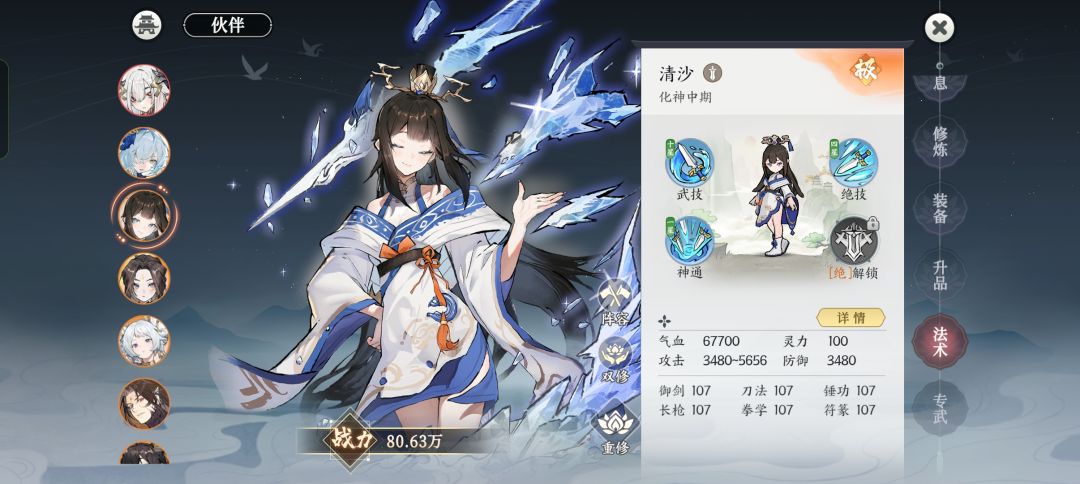 目前我用的御空法器是三星的110级水剑,我个人比较喜欢专精,所以这是我目前的能用的资源,而且也可以看出我并没有实现绑玉自由,而且打算用金/水剑或者金/水符。因此上阵的也是相关属性