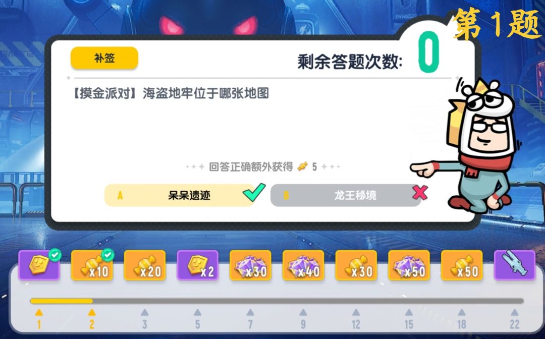 注意:如果漏签需要使用5个彩虹补给箱钥匙进行补签一题