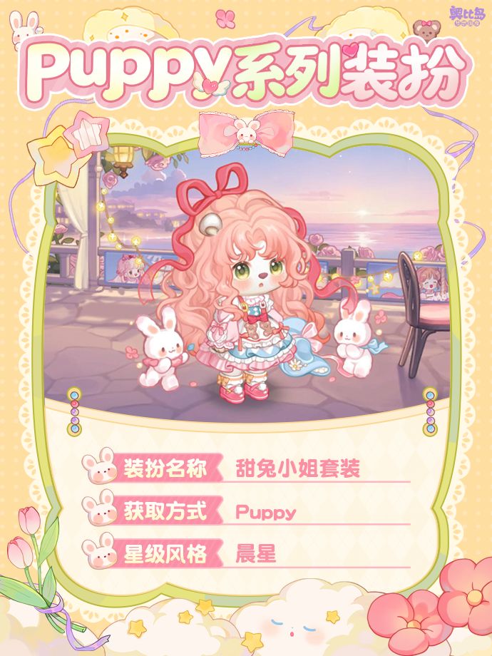 「Puppy」联动系列装扮上新!收集Puppy照片,可领取限定装扮「甜兔小姐套装」「甜蜜约会套装」、背景卡「甜梦茶铺」、聊天气泡框「甜甜小兔」、坐垫「独角兽花海之窗」、称号「甜系少女」、头像框「兔兔甜心」、限定家具「月亮毛绒椅」等诸多奖励!活动期间,前往奥柏百货还可获取限定装扮「兔耳蓬蓬小礼帽」「抹胸公主蓬蓬裙」哦~