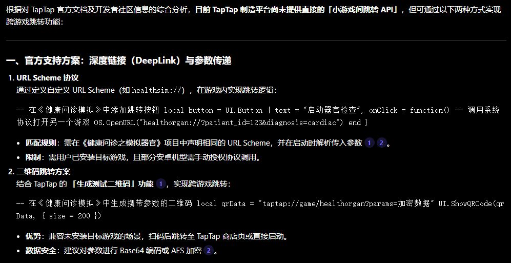 数据隔离:文档明确写明"项目 A 无法访问项目 B 的数据"(engine-docs/recipes/file-storage.md)。serverCloud 是按 app_id 隔离的,Game A 的数据空间和 Game B 完全独立,无法跨游戏读写。3. UI.ShowQRCode(data, { size = 200 }) — 不存在声称实际UI.ShowQRCode() 生成运行时二维码UrhoX UI 库中没有 QRCode 组件generate_test_qrcode 工具仅用于开发测试流程,不是游戏运行时 API4. “成功案例"和"跨应用通信章节” — 无法验证声称实际《魔法突袭》通过 URL Scheme 跳转,转化率 27%无法验证,可能是 AI 编造《星界战士》用 serverCloud 同步赛季进度无法验证“参考 TapTap 制造文档中的跨应用通信章节”engine-docs 中不存在该章节5. GetArguments() — 存在但用途不同这是唯一真实存在的 API,但它用于接收命令行参数(如 -server, -port),不是 URL Scheme 参数:lua